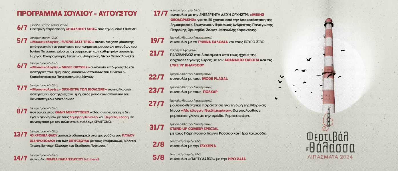 Το "Φεστιβάλ στη Θάλασσα" θα πραγματοποιηθεί στον πολυχώρο Λιπασμάτων στη Δραπετσώνα. Πρόκειται για ένα πολιτιστικό φεστιβάλ που ξεκίνησε το 2017 και διοργανώνεται κάθε καλοκαίρι και περιλαμβάνει μια πληθώρα εκδηλώσεων όπως συναυλίες, θεατρικές παραστάσεις με ελεύθερη είσοδο για το κοινό.