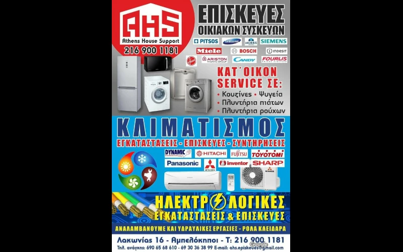 Η εταιρία Αthens House Support στους Αμπελοκήπους, είναι μία επιχείρηση που δραστηριοποιείται στον χώρο της επισκευής οικιακών συσκευών. Διαθέτει έμπειρους τεχνικούς και μπορεί να ανταποκριθεί άμεσα και με υπευθυνότητα σε όλες τις ανάγκες επισκευών που μπορεί να προκύψουν σ’ ένα νοικοκυριό.
